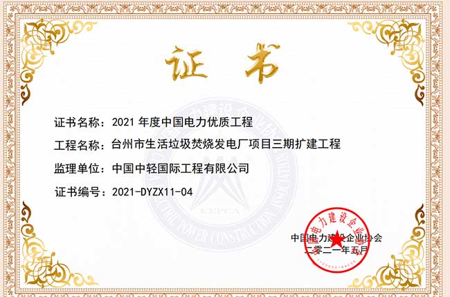 • 台州垃圾焚烧电厂项目荣获电力工程优质奖