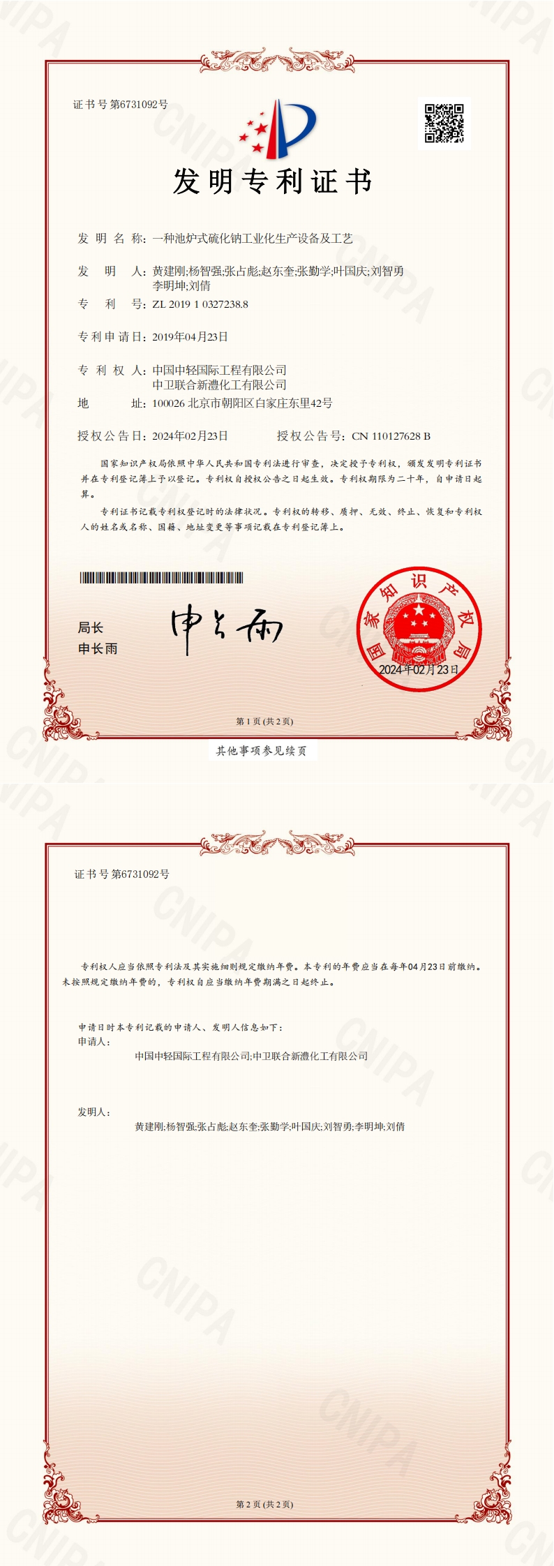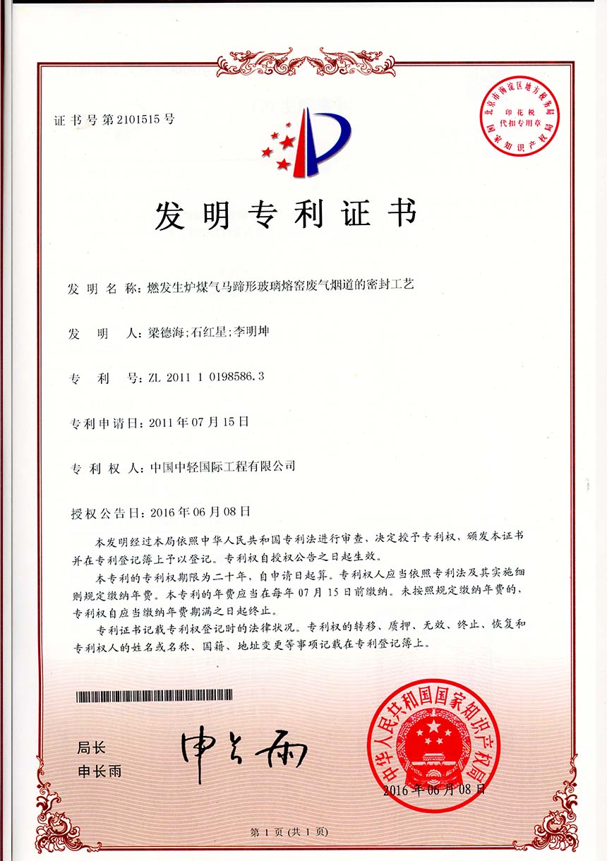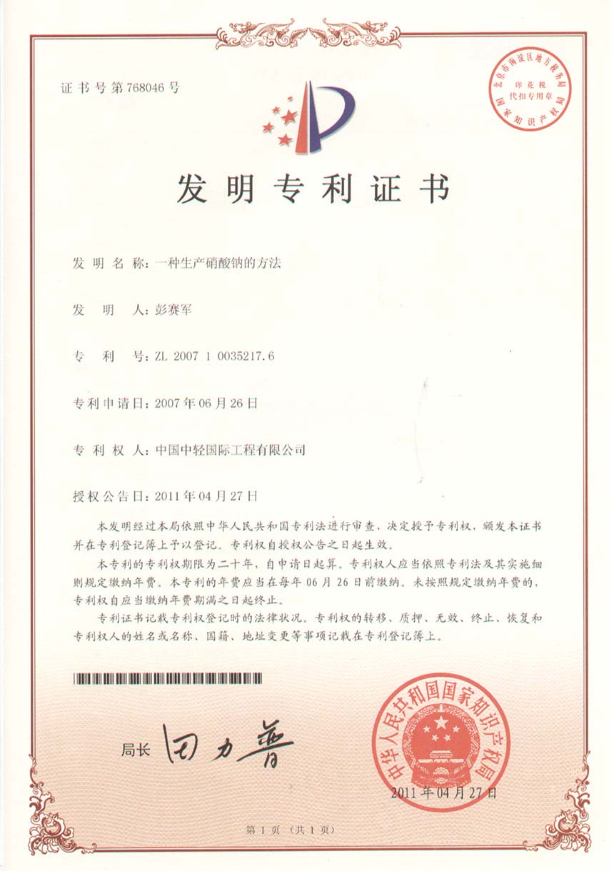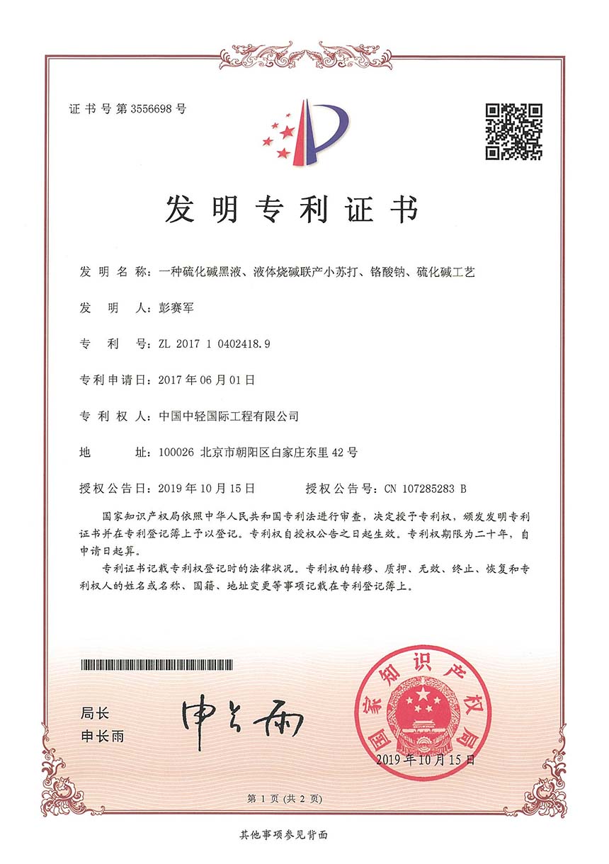 • 发明专利证书-一种硫化碱黑液、液体烧碱联产小苏打、铬酸钠、硫化碱工艺
