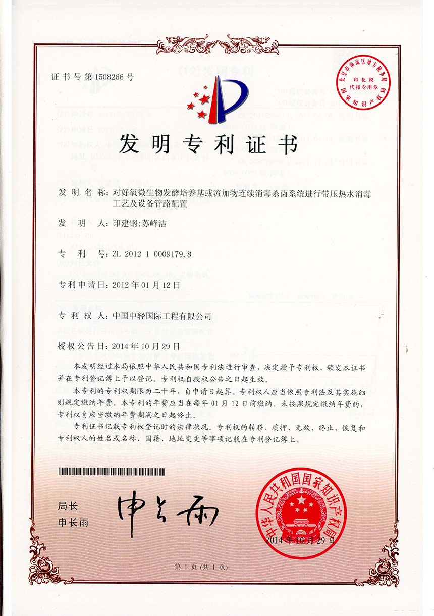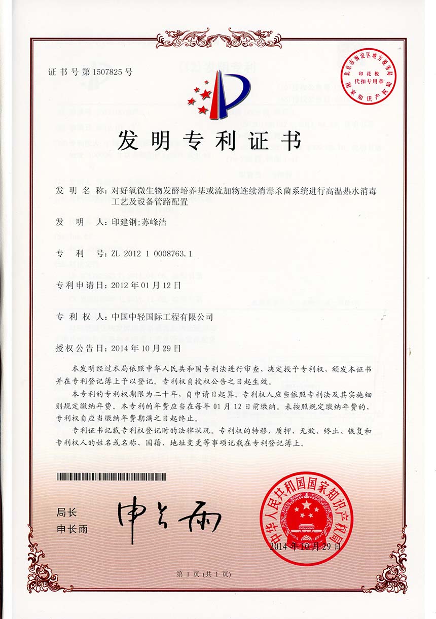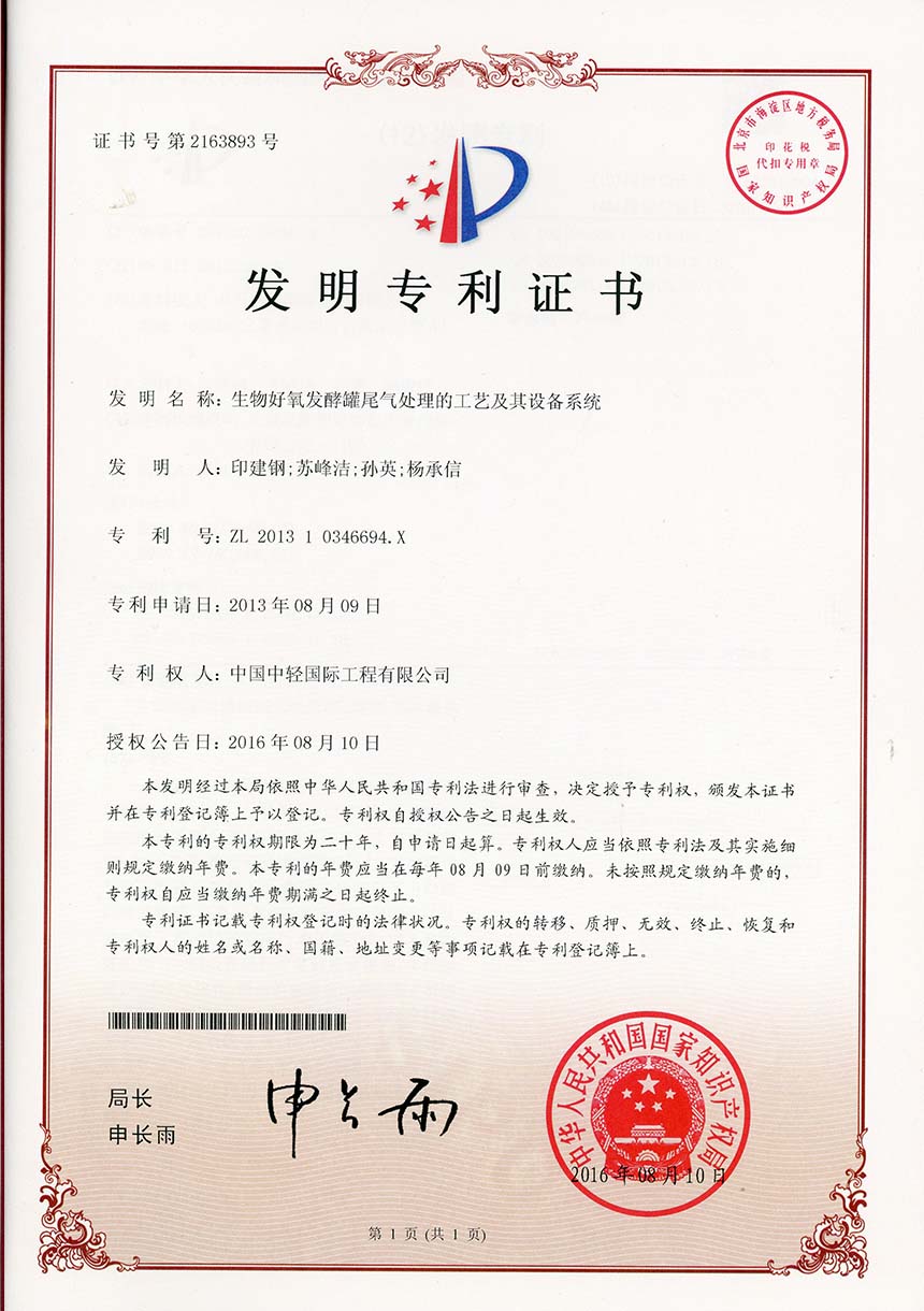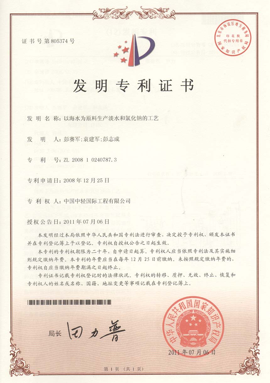 • 发明专利证书 一种高盐COD废水回收工艺