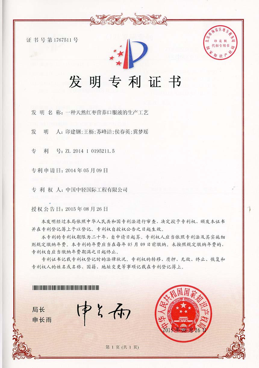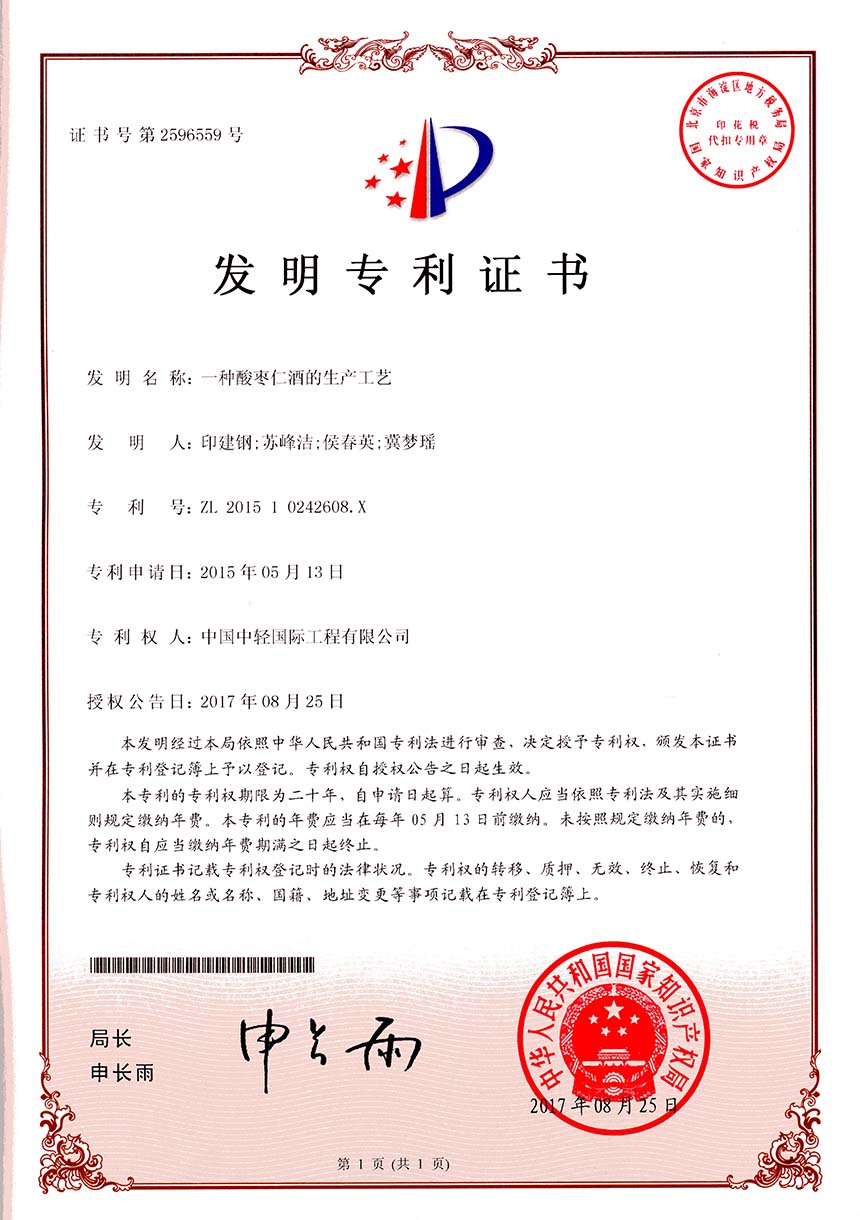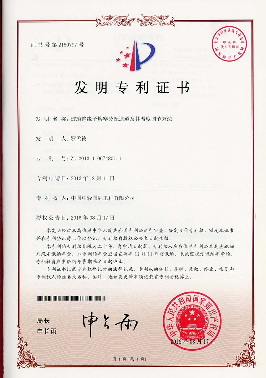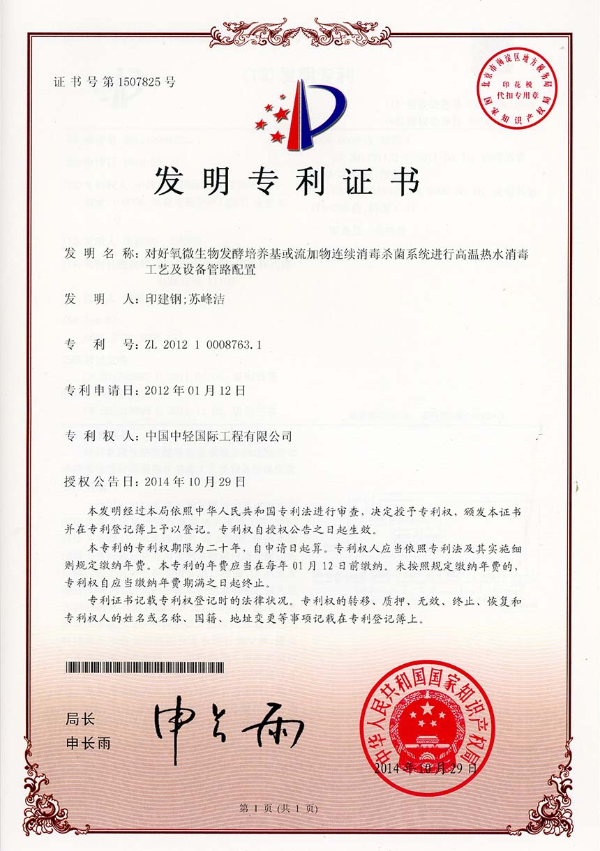 • 发明专利证书 一种高盐COD废水回收工艺