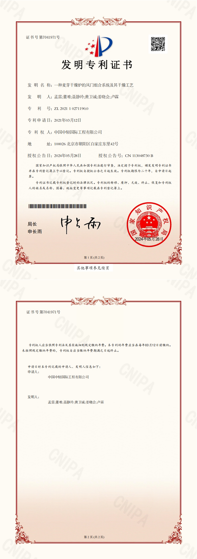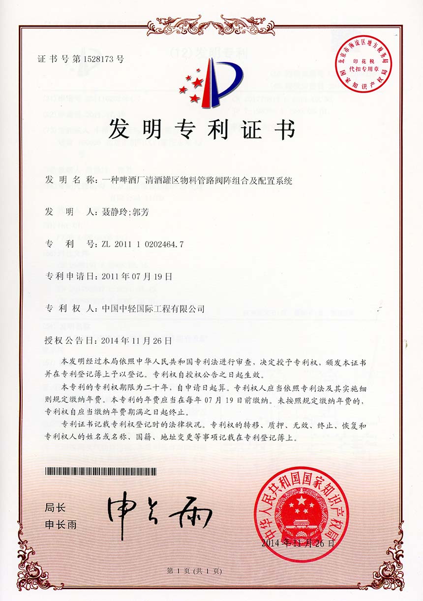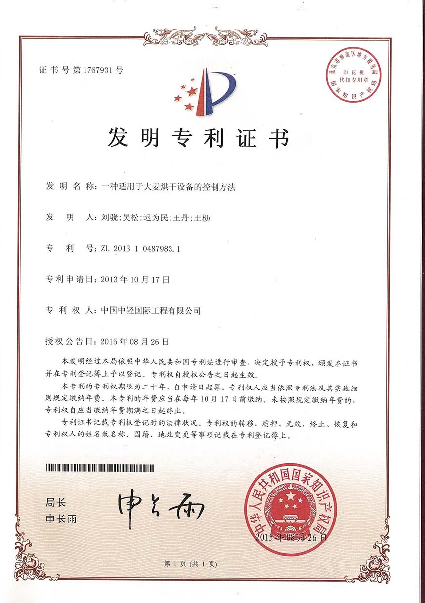• 实用新型证书 一种麦芽干燥炉的风门组合系统