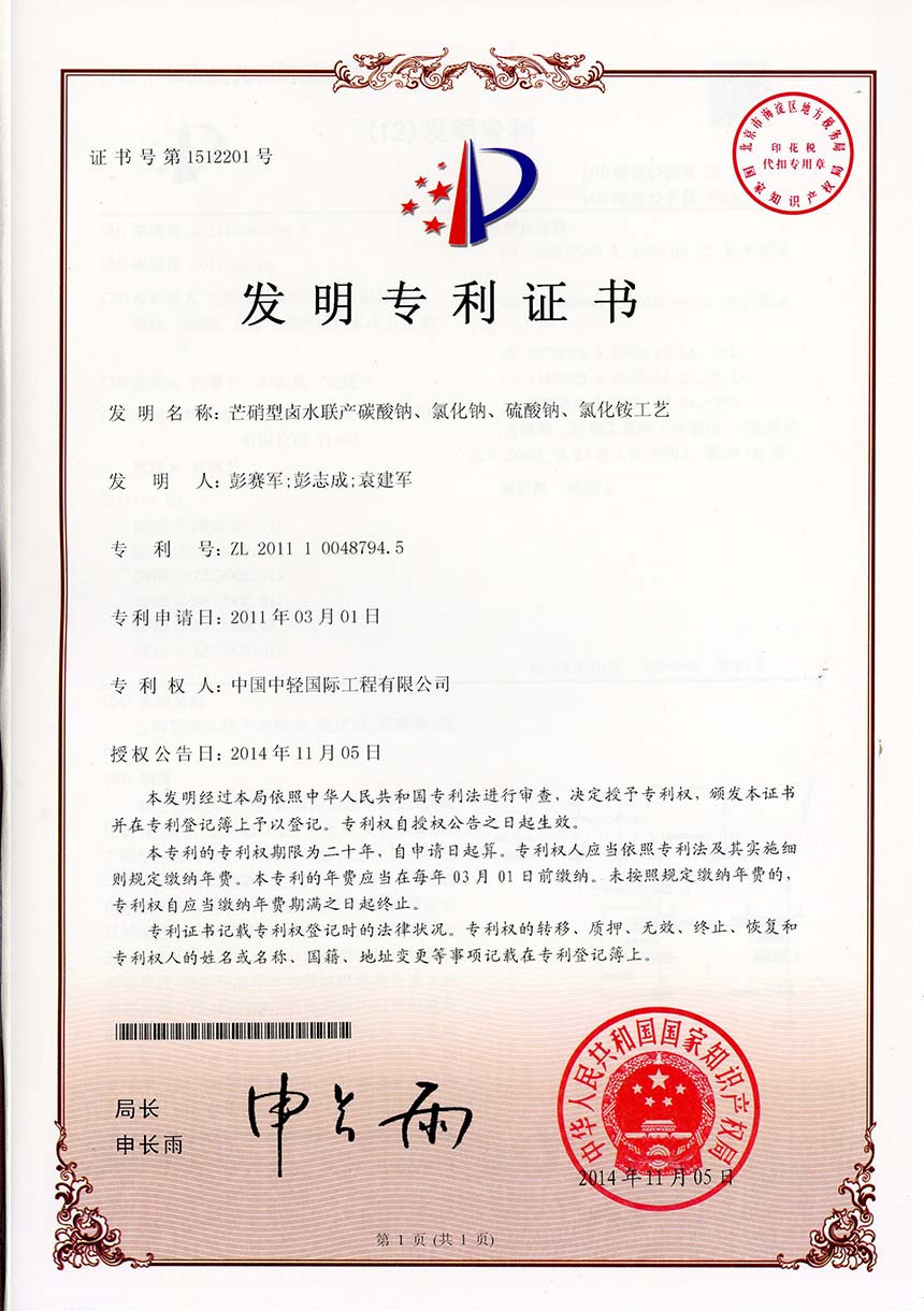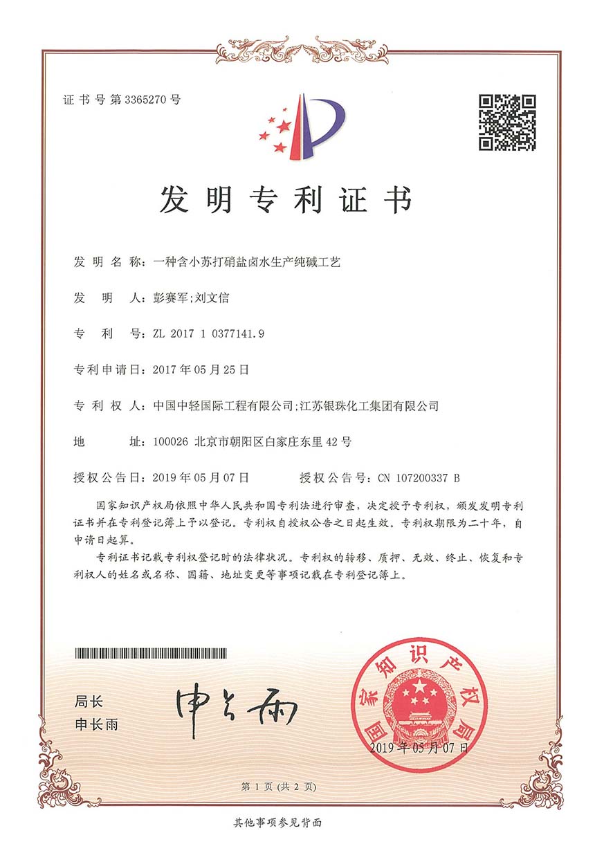 • 发明专利证书-一种含小苏打硝盐卤水生产纯碱工艺