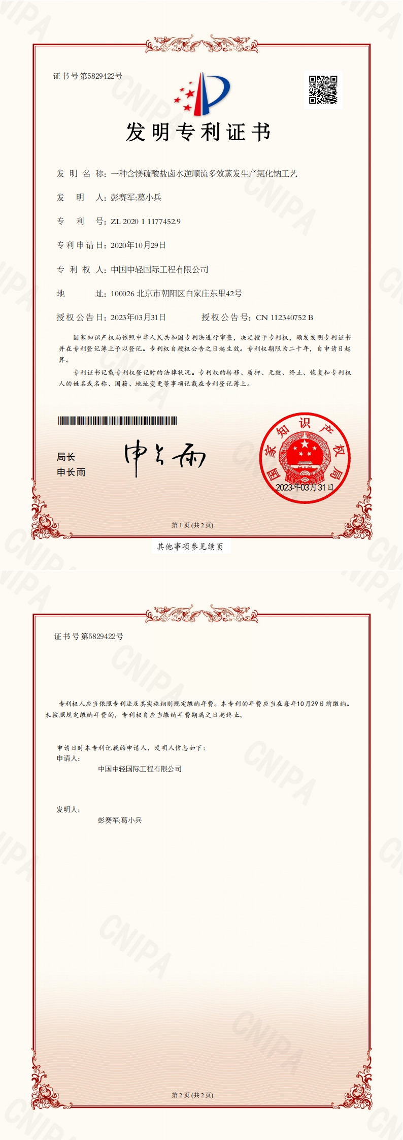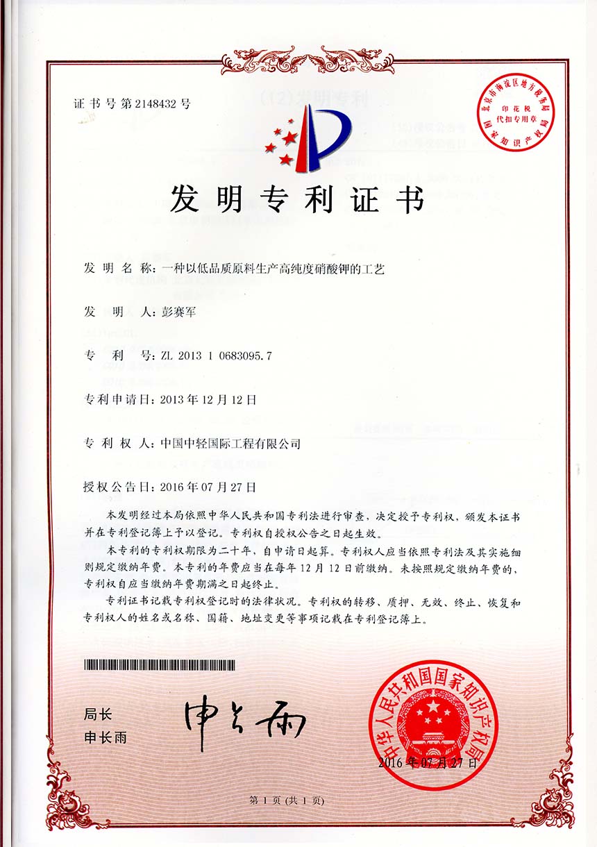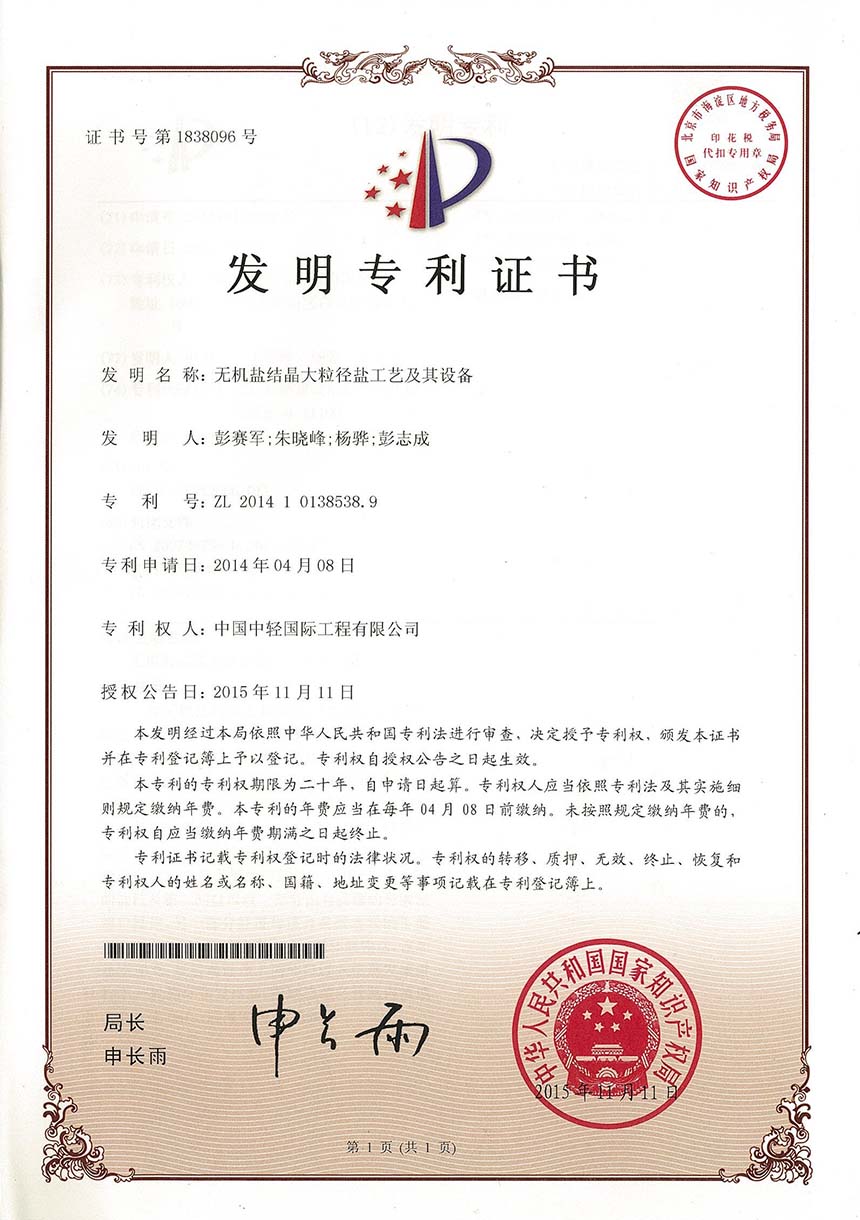 • 发明专利证书 一种盐硝体系卤水蒸发生产盐硝工艺