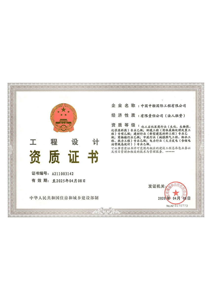 • 工程设计乙级资质 有效期2025年4月8日