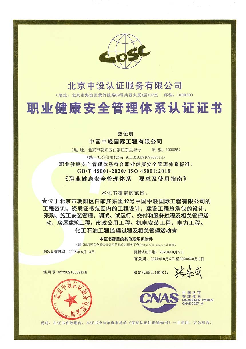• 职业健康安全管理体系认证 有效期2023年8月8日