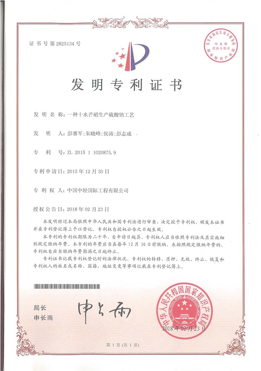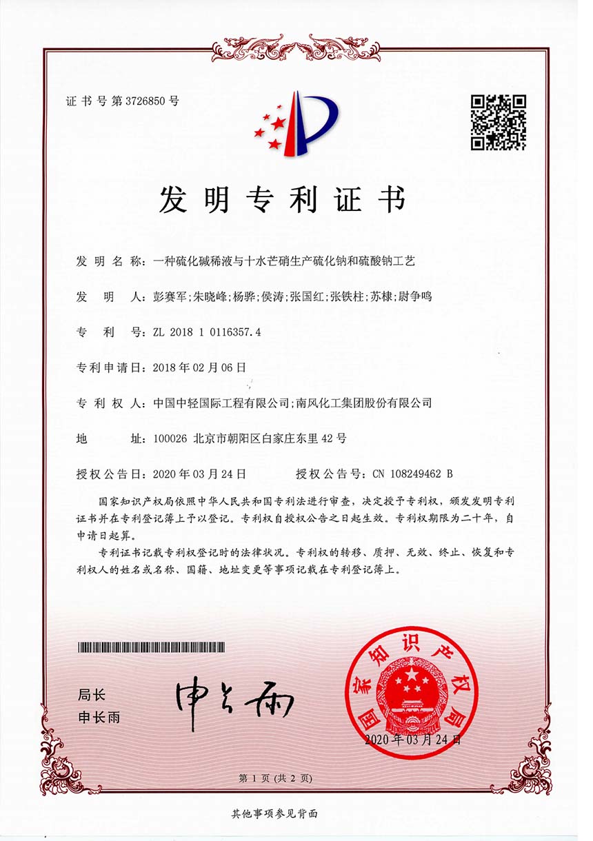 • 发明专利证书 一种硫化碱稀液与十水芒硝生产硫化钠和硫酸钠工艺