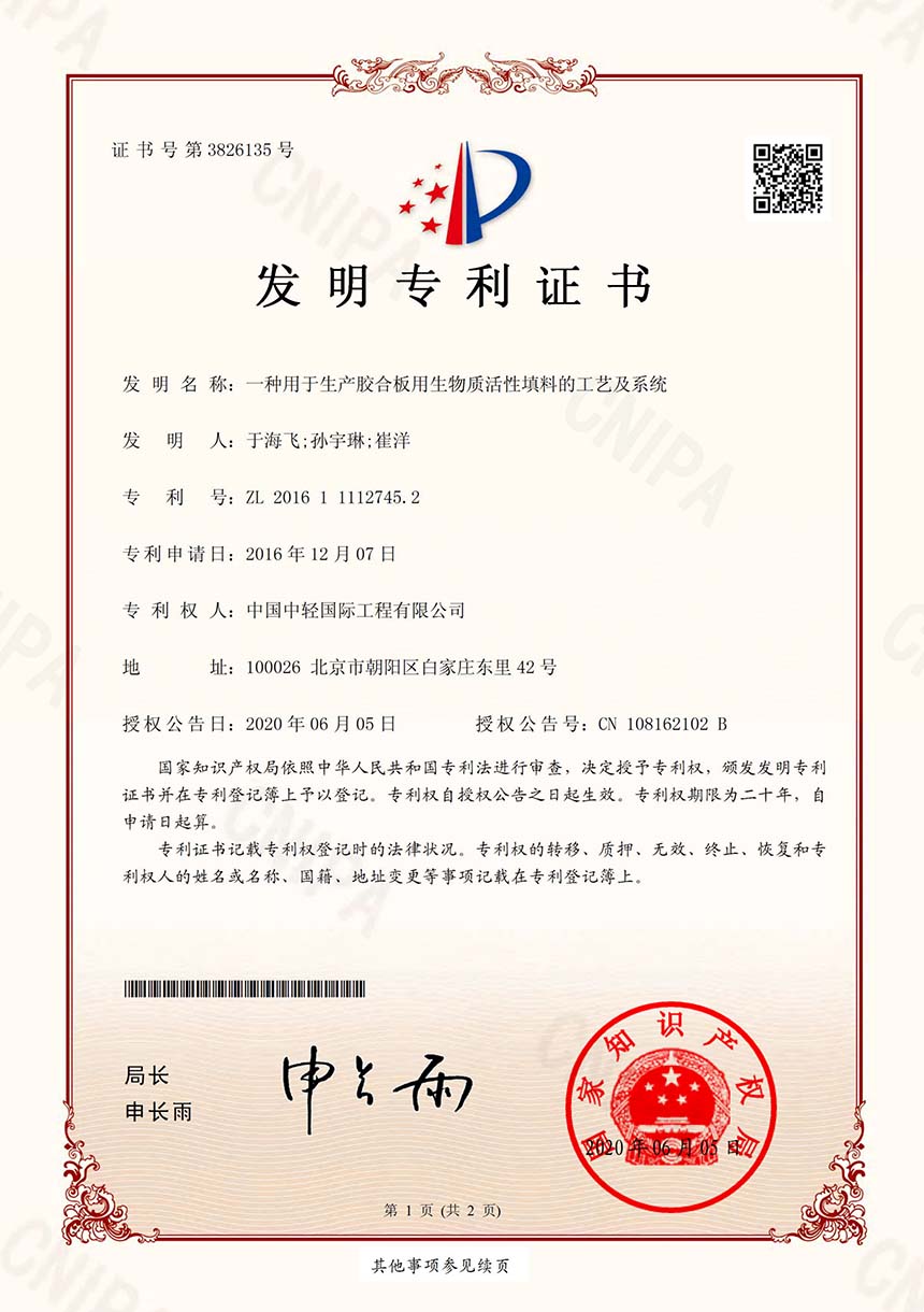 • 发明专利证书 一种用于生产胶合板用生物质活性填料的工艺及系统