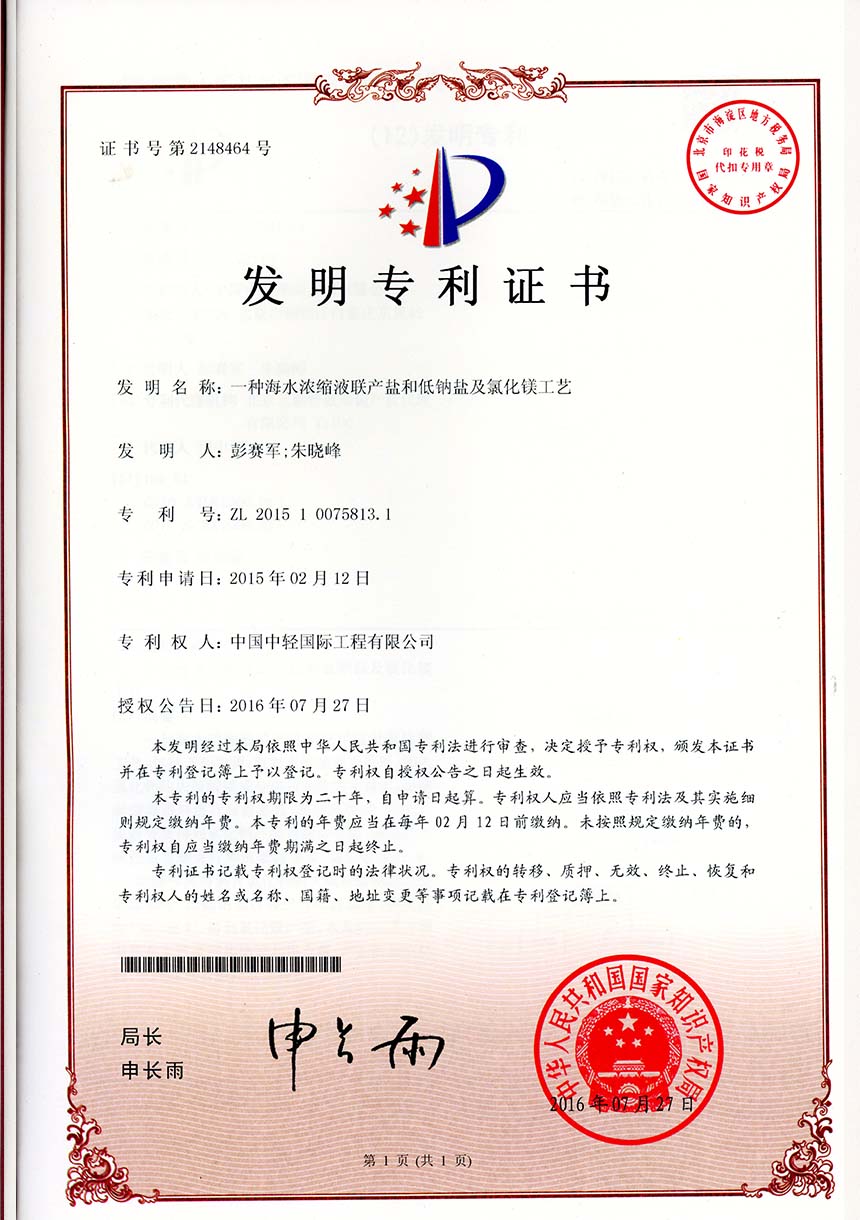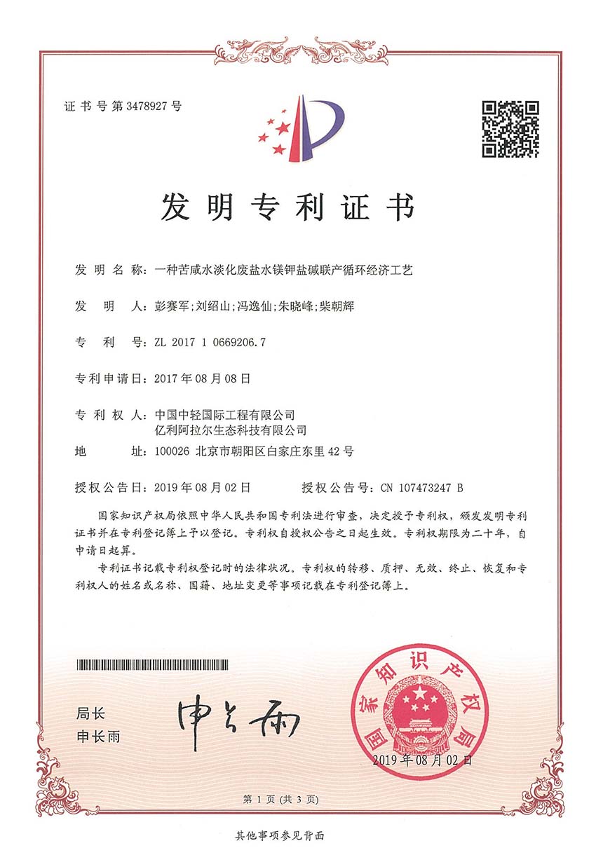 • 发明专利证书-一种苦咸水淡化废盐水镁钾盐碱联产循环经济工艺