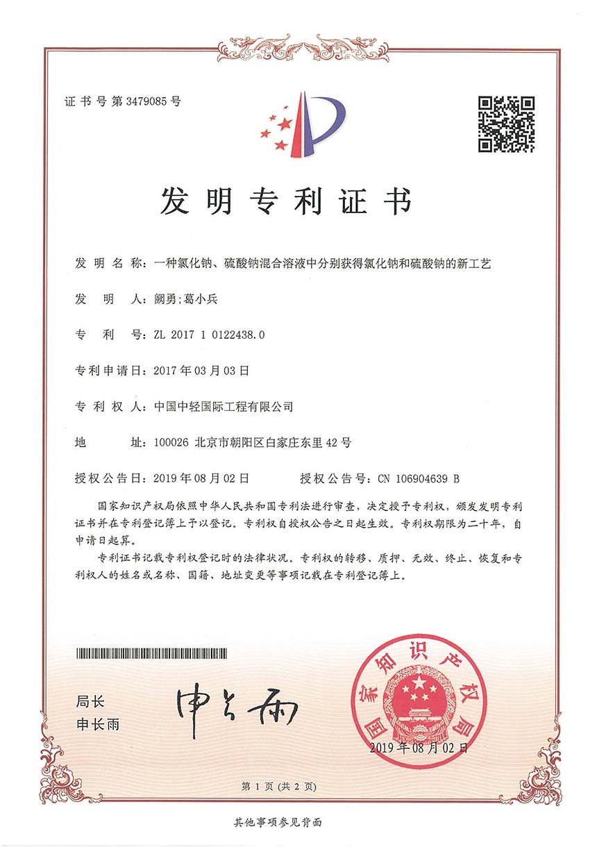 • 发明专利证书-一种氯化钠、硫酸钠混合溶液中分别获得氯化钠和硫酸钠的新工艺