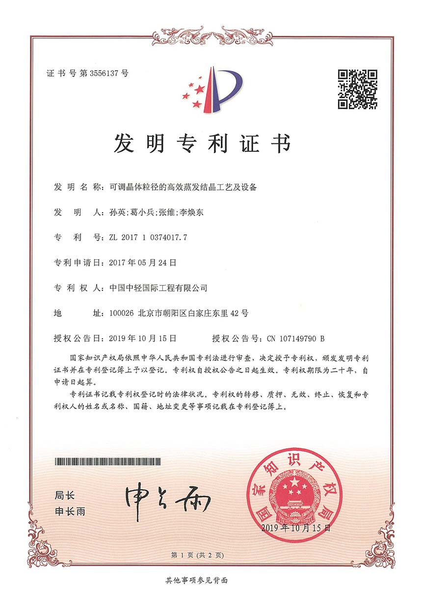 • 发明专利证书-可调晶体粒径的高效蒸发结晶工艺及设备