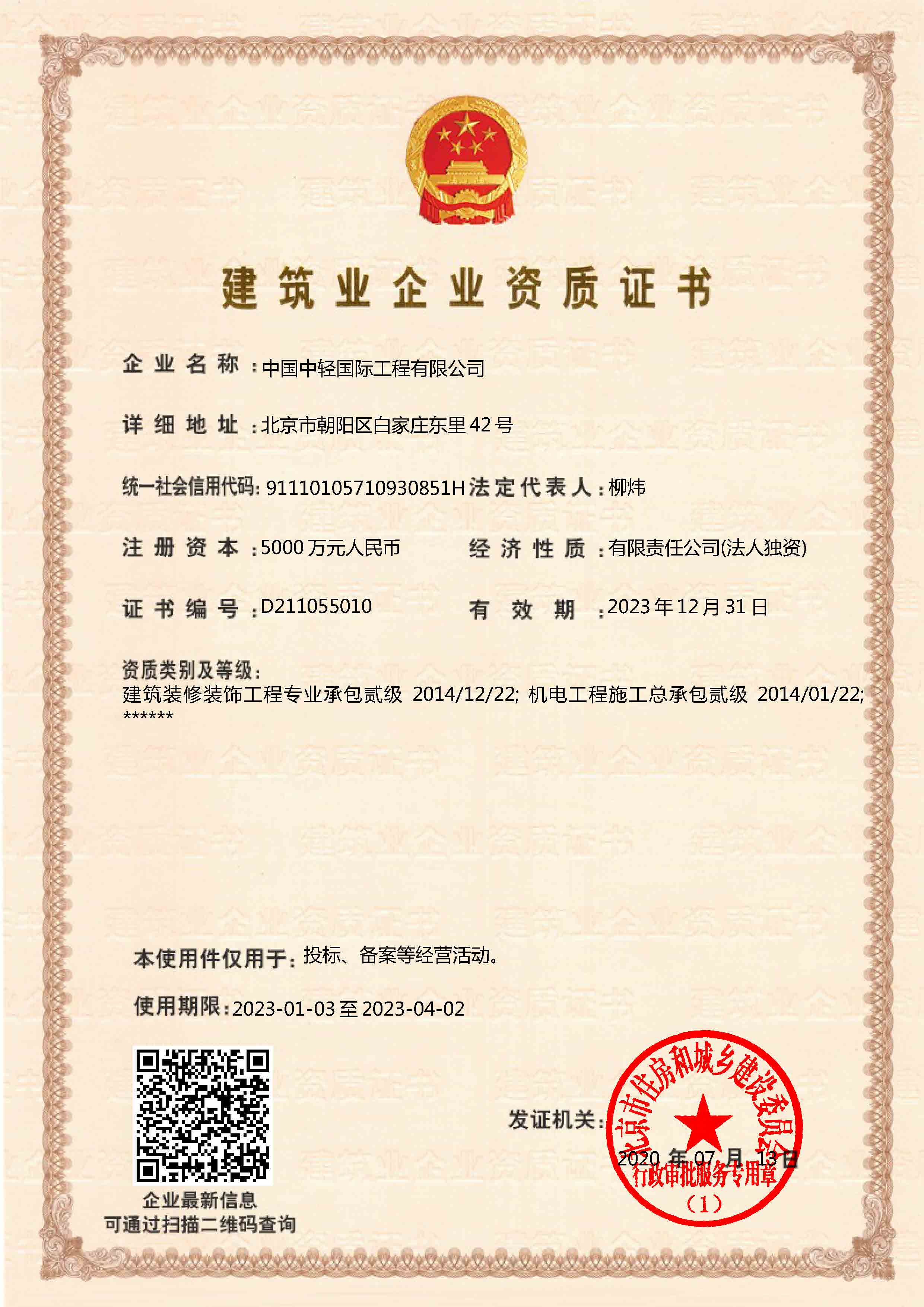 • 机电工程施工总承包二级 建筑装修装饰工程专业承包贰级 2023年4月2日