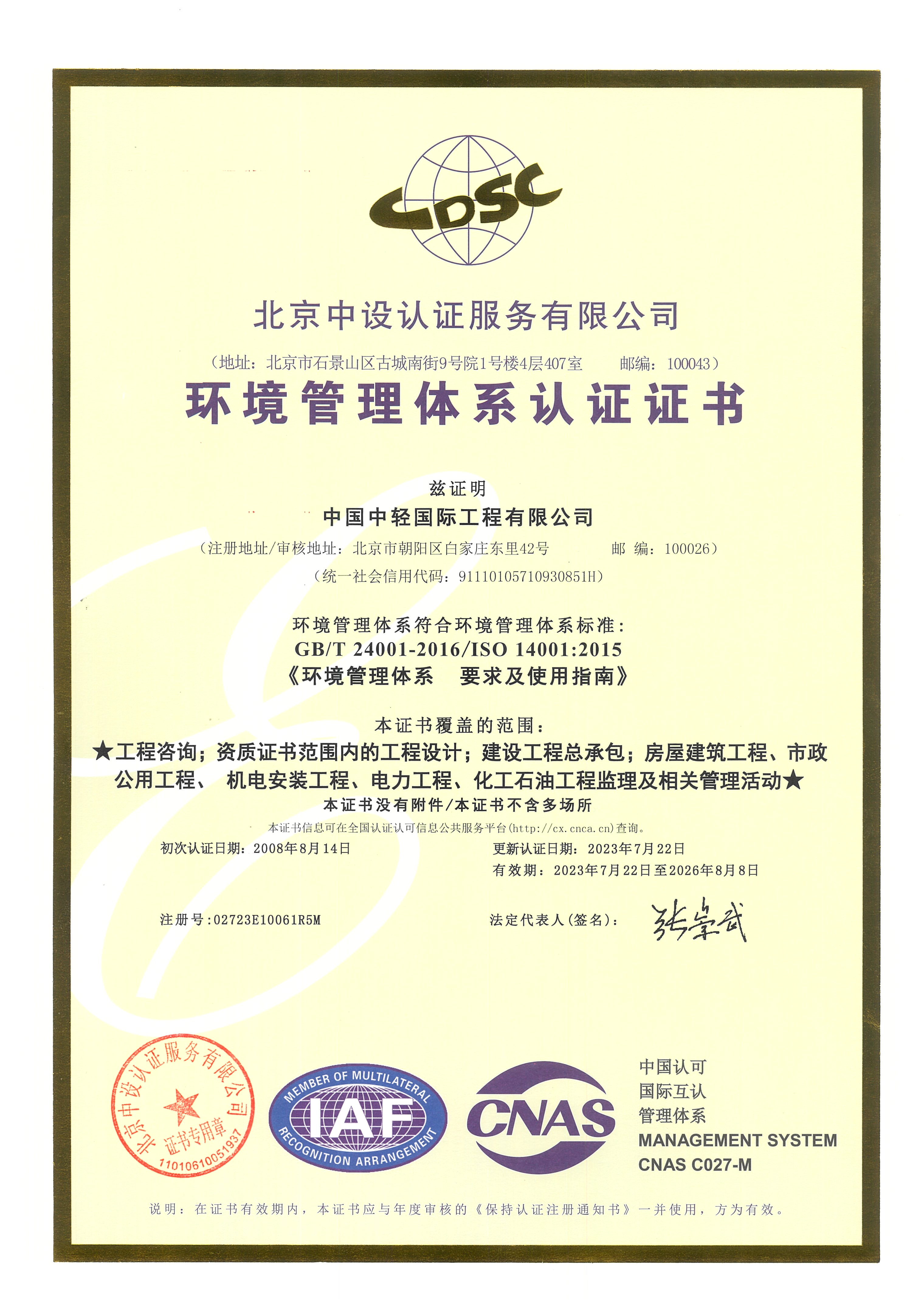 • 环境管理体系认证 有效期至2026年8月8日