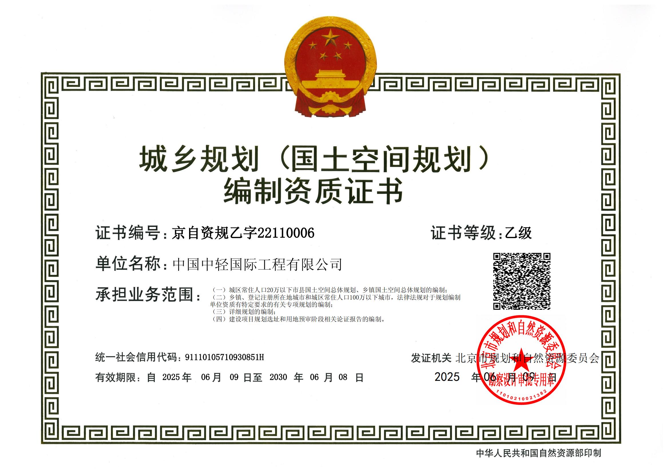 • 城乡规划编制资质证书(乙级)2030年6月8日
