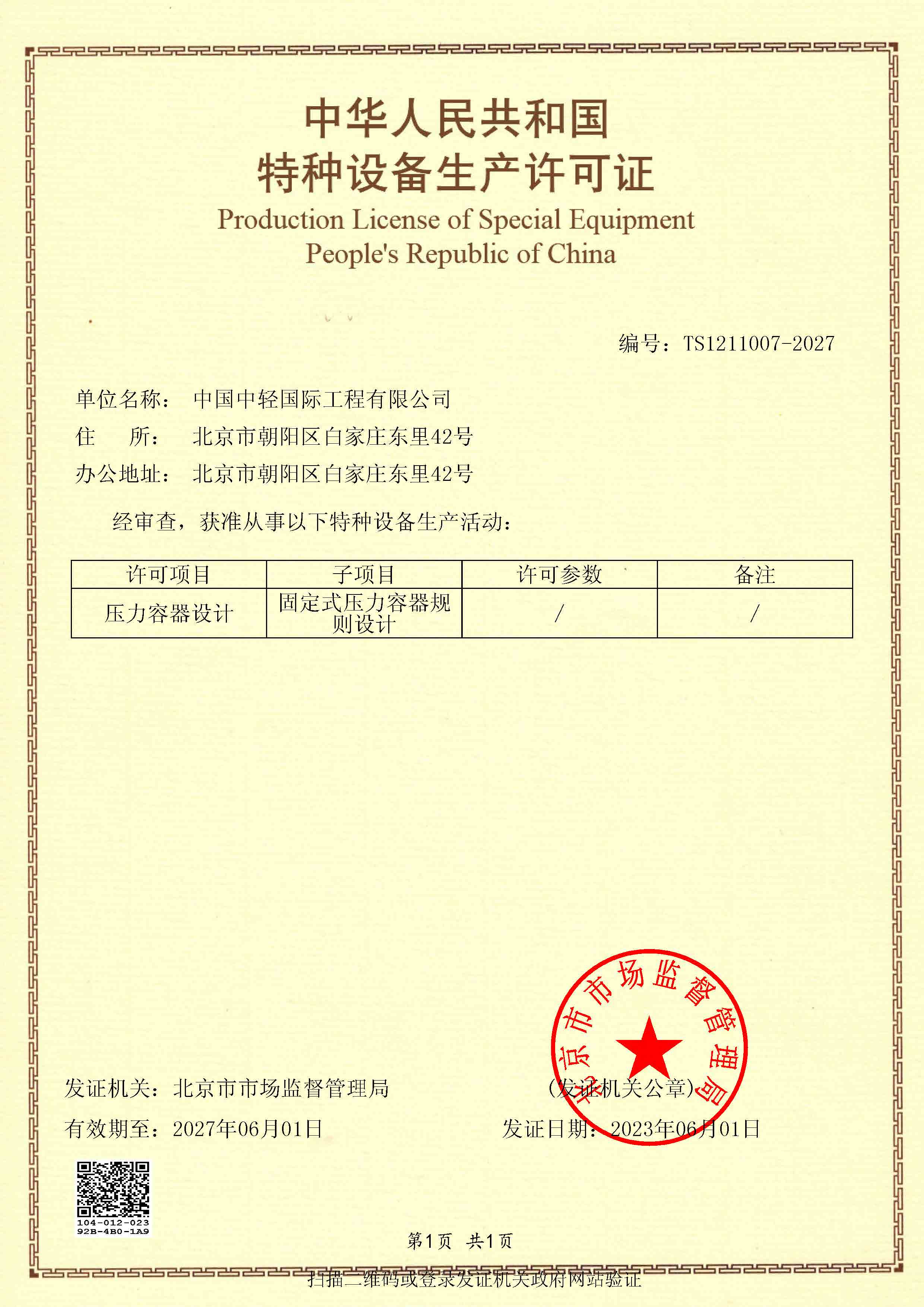 • 特种设备设计许可证(压力容器)2027年6月1日