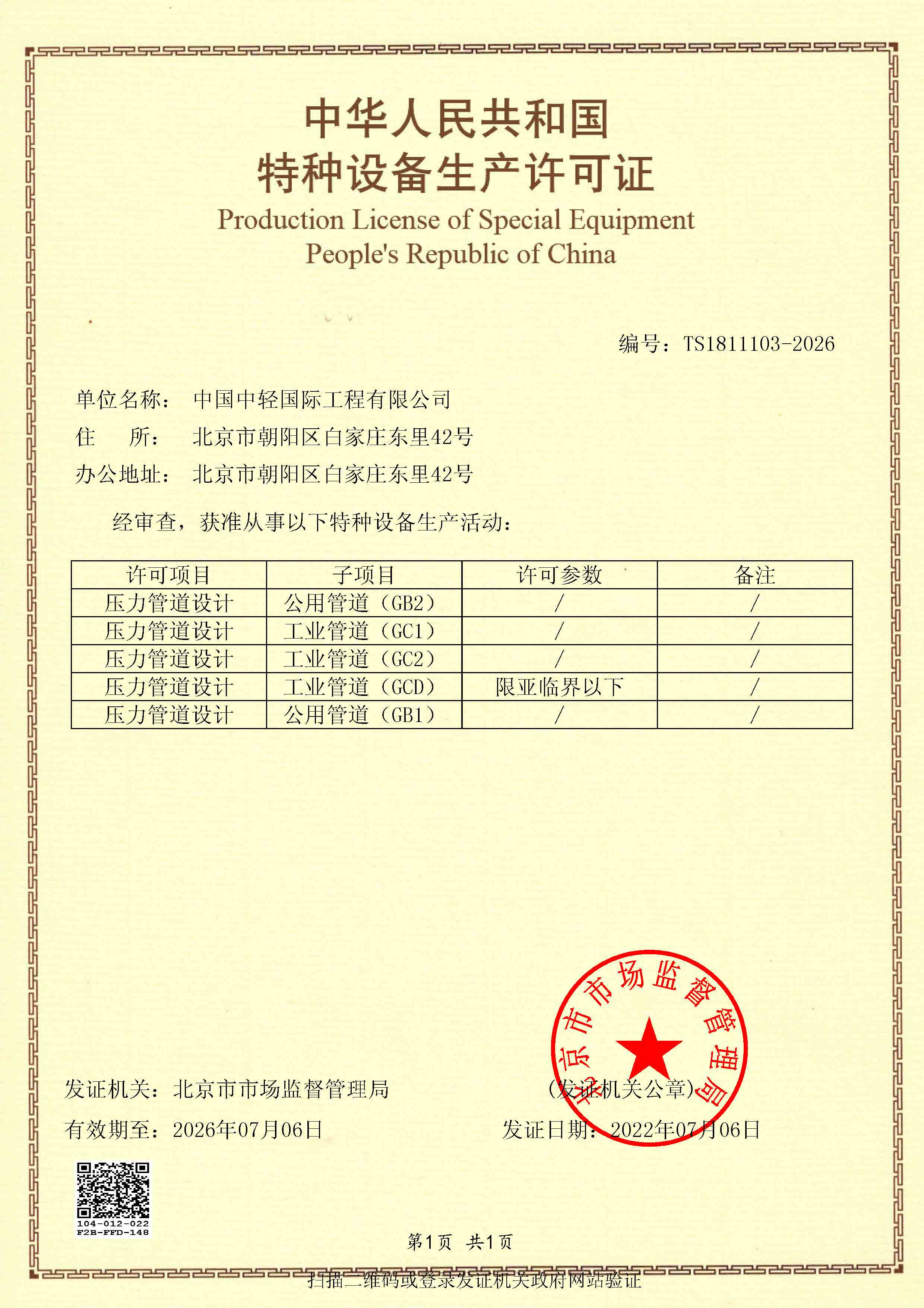 • 特种设备设计许可证(压力管道)2026年7月6日