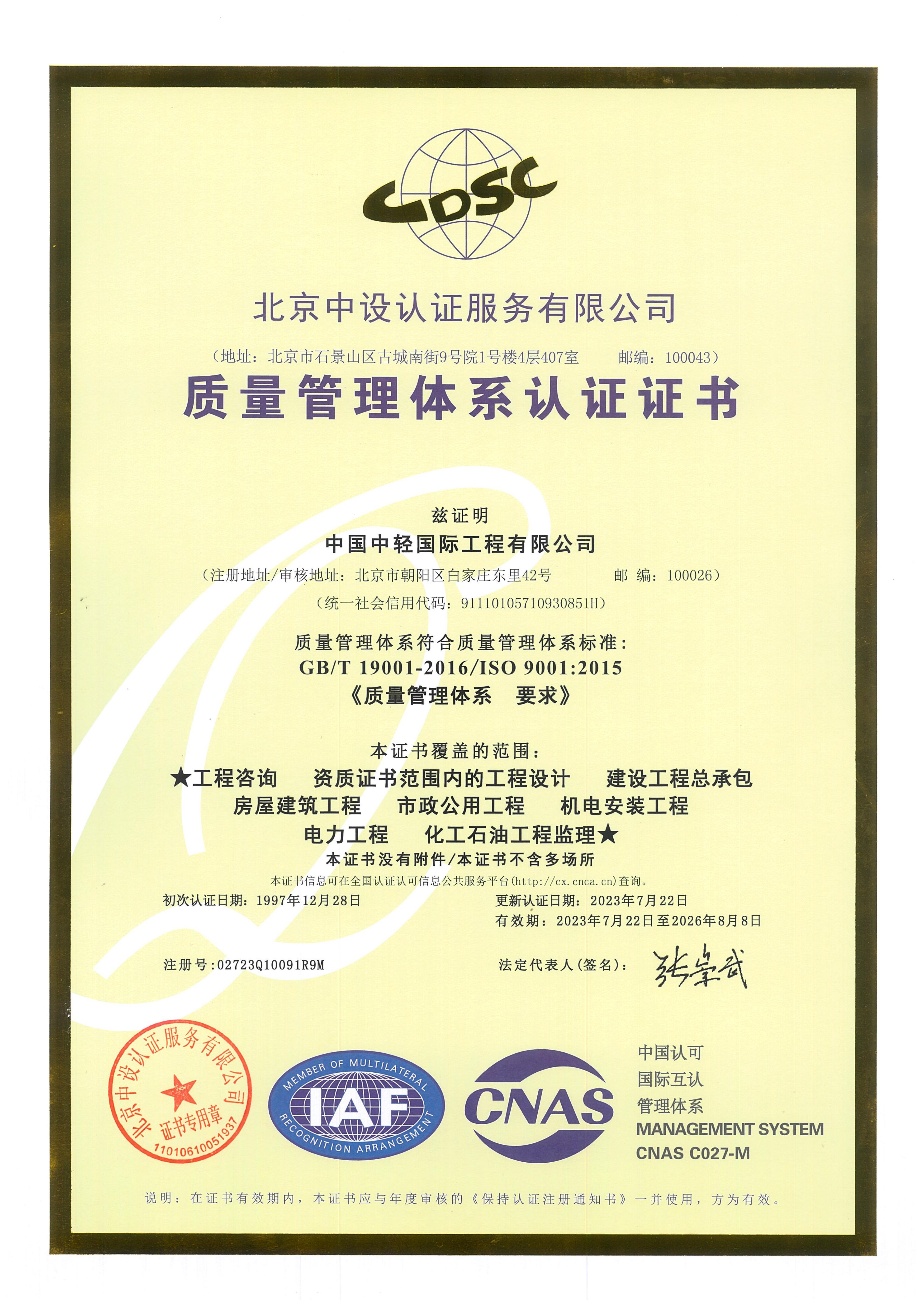 • 质量管理体系认证 有效期至2026年8月8日