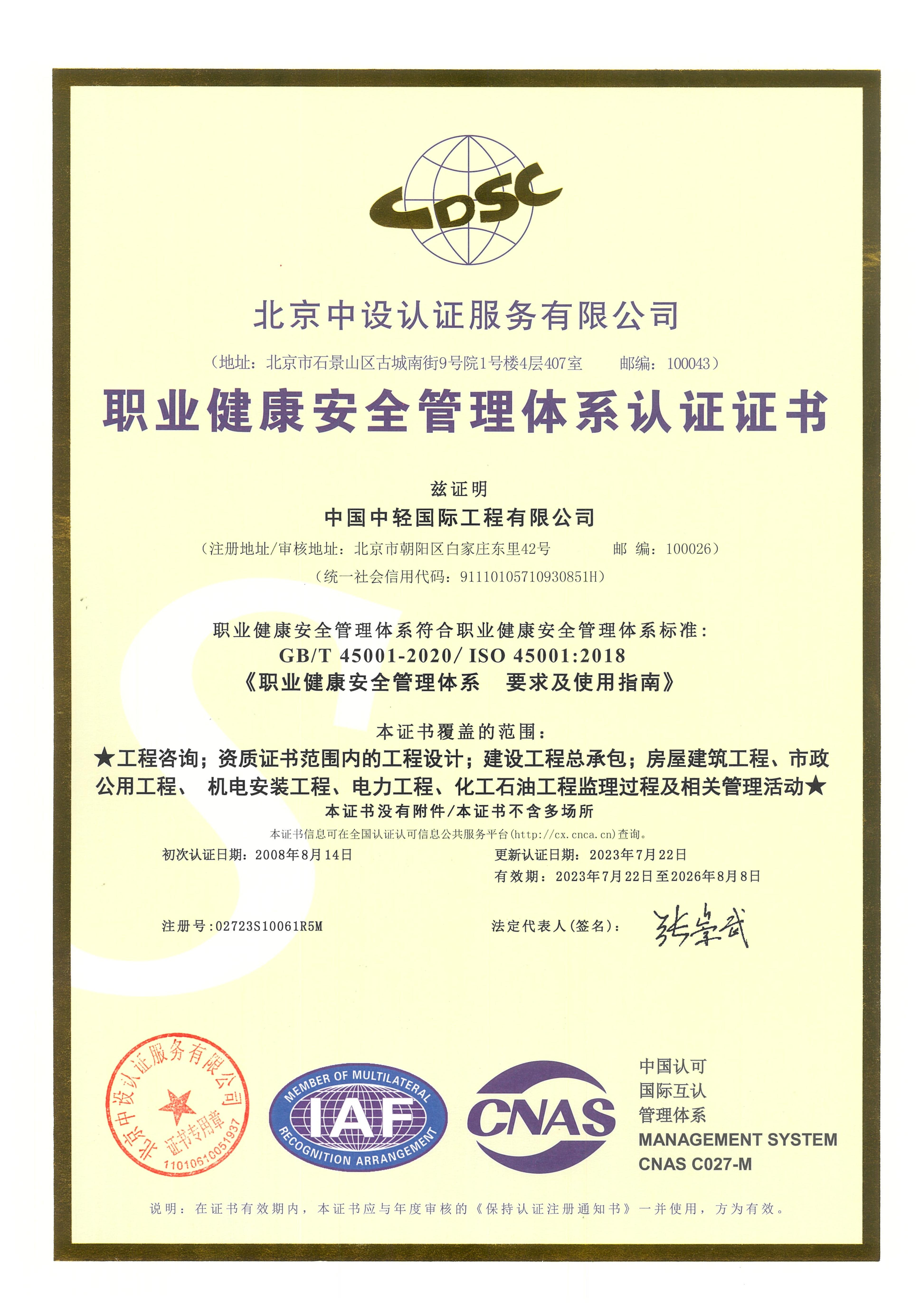 • 职业健康安全管理体系认证 有效期至2026年8月8日